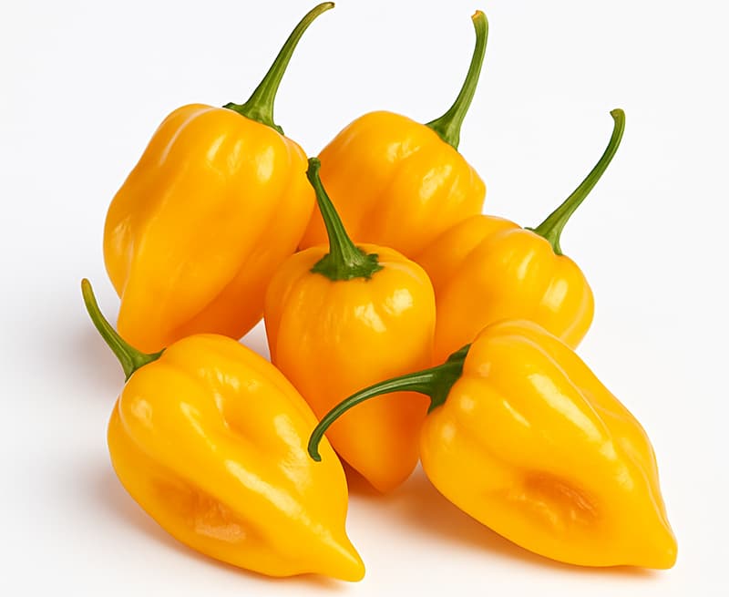 A variety of chili pepper of the Capsicum chinense type, extremely hot. Although it takes a long time to grow, it is known for its productivity. Each plant produces dozens of wrinkled, shiny, globular, elongated fruits that are bright yellow in color and approximately 3-4 cm long and wide. These fruits have the typical fruity flavor of habaneros, to which they are closely related. Depending on growing conditions, the plants are medium to tall in height (45 to 75 cm).